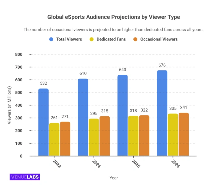 In 2026, the global eSports audience is estimated at 676 million viewers worldwide, including 335 million dedicated fans and 341 million occasional viewers.