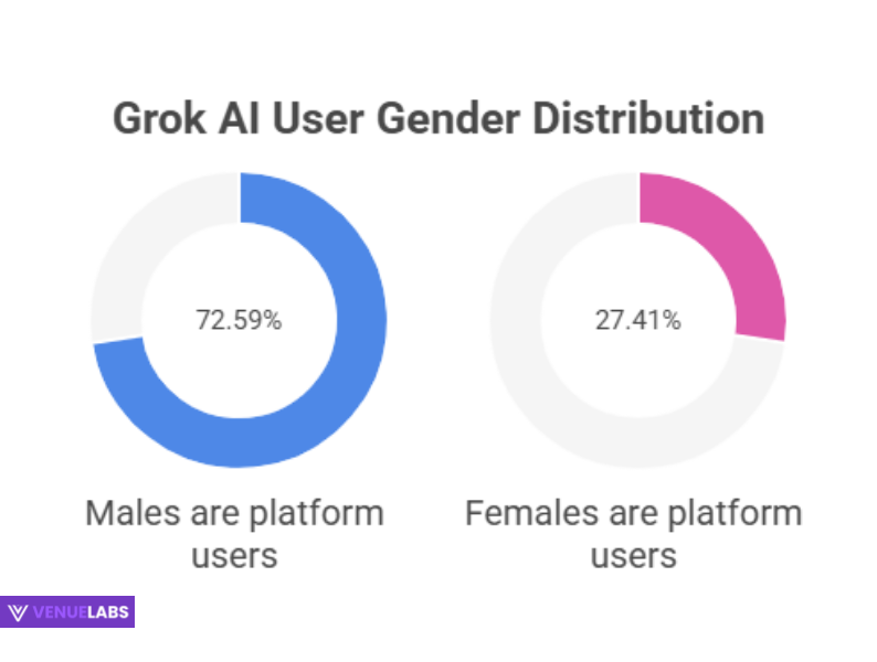 Grok AI currently shows a noticeable gap in gender distribution, with a significant majority of male users. One source states that males make up 72.59% of the platform’s user base, while females account for 27.41%. Another report indicates 66.91% male and 33.09% female.