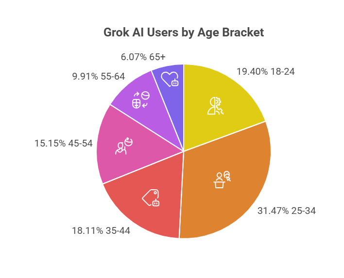 • Age Demographics: Most Grok users are between the ages of 25 and 34, representing 31.47% (another source states 33.39%) of the total audience.