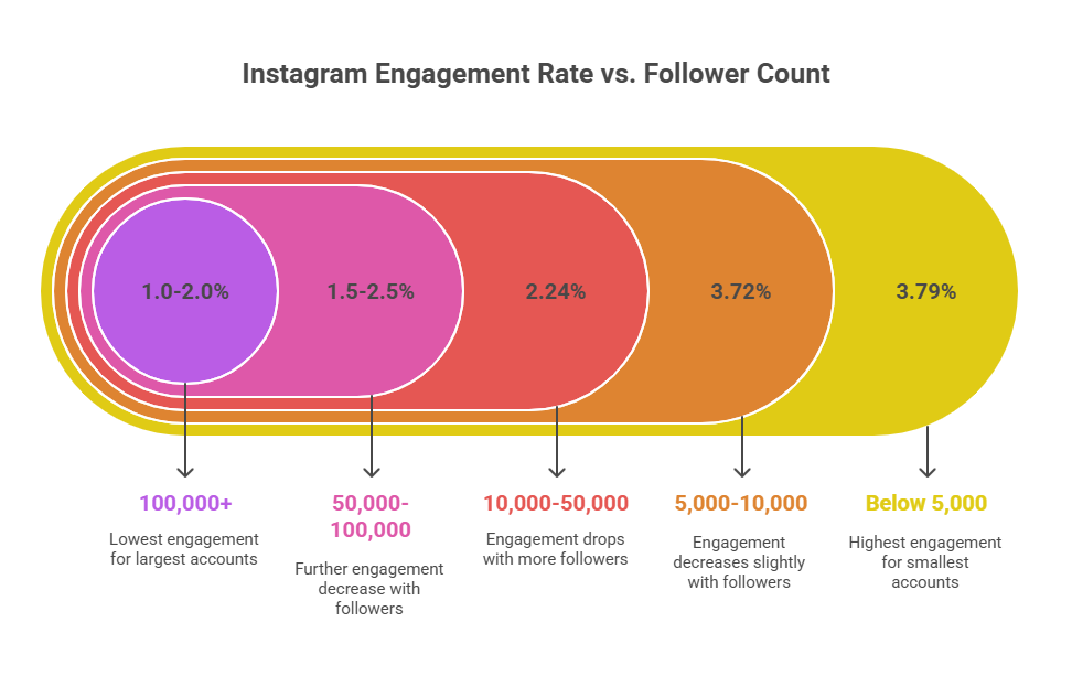 This leads to higher levels of interaction, trust, and loyalty. As an account grows, the audience naturally broadens, and maintaining that intimate connection with every follower becomes more challenging, leading to a slight dip in percentage-based engagement.