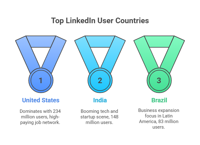 The U.S. holds the top spot with 234 million users, where high-income professionals drive activity. India ranks second with 148 million, boosted by tech sectors. Brazil has 83 million, emphasizing Latin American business. China maintains 58 million, focusing on international links.