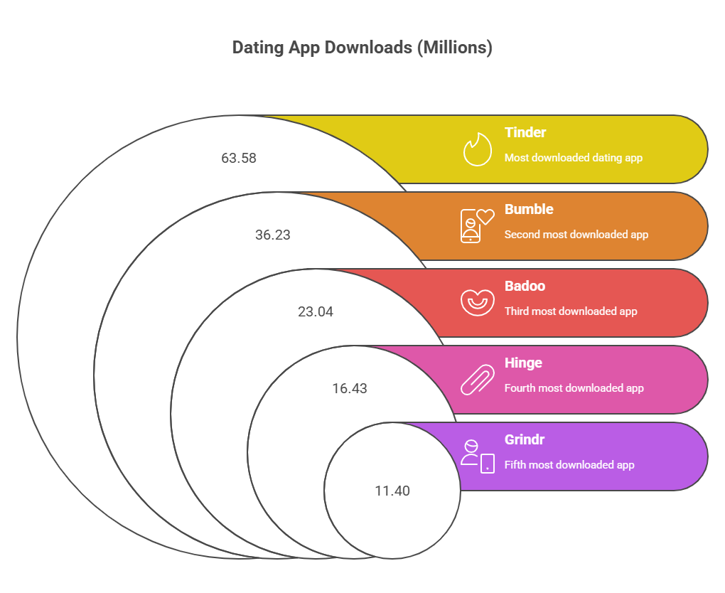 • Downloads: Tinder continues to lead the market in new users, recording over 6.5 million downloads in May 2025 alone, and a staggering 63.58 million downloads in 2024.