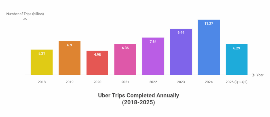 In the first half of 2025 alone, Uber drivers completed an astounding 6.29 billion trips, generating a total revenue of $24.18 billion.