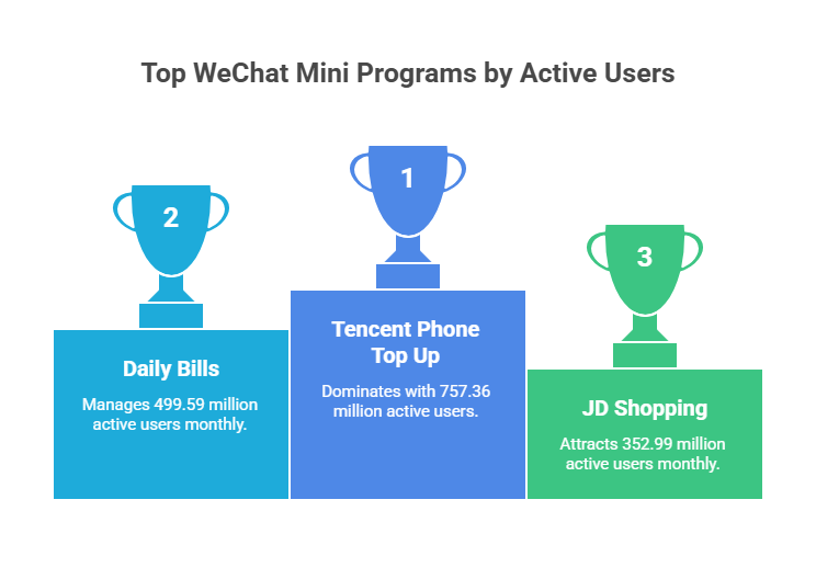 Here’s a look at some of the top WeChat Mini Programs by monthly active users, showcasing the diversity and transactional focus of this ecosystem: